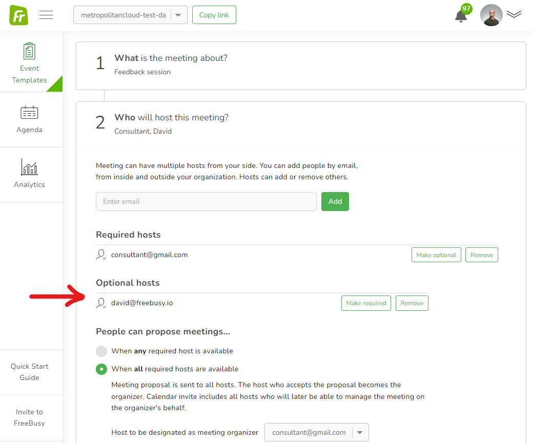 When an event template is set up for the Consultant, Project Coordinator would be included as an optional host:
