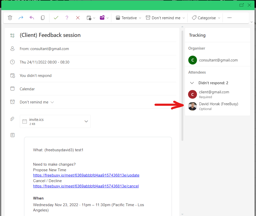 When Consultant accepts a meeting proposal, you are automatically included in the calendar event (as an optional participant). This means you can easily keep track of scheduled meetings directly in your (Outlook) Calendar. Scheduled Events will be listed as any other event.