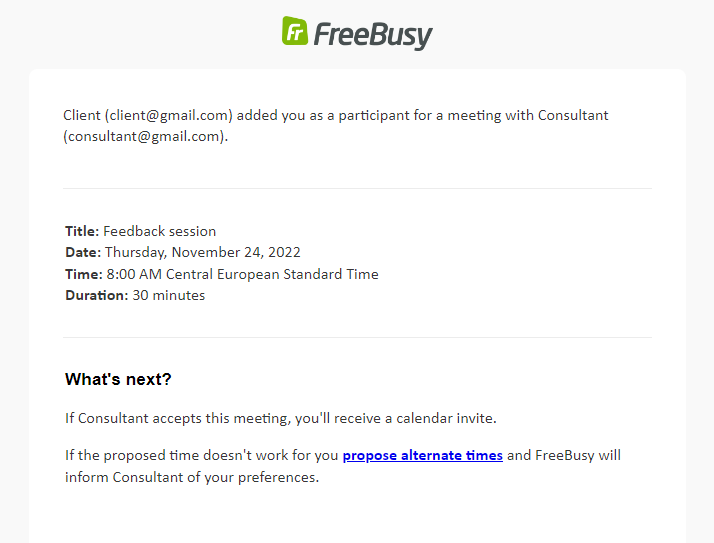 You will receive an email notification when a Client proposes a meeting with the Consultant. This way you can keep track of times that Clients are proposing to the Consultant.