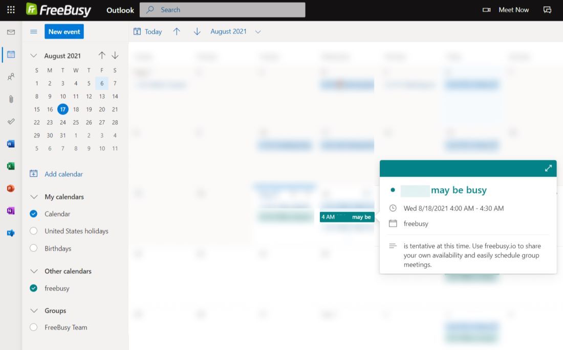 Once you or your colleague have successfully subscribed the calendar feed you will be able to see Free/Busy events on the calendar similar to following screenshot.
