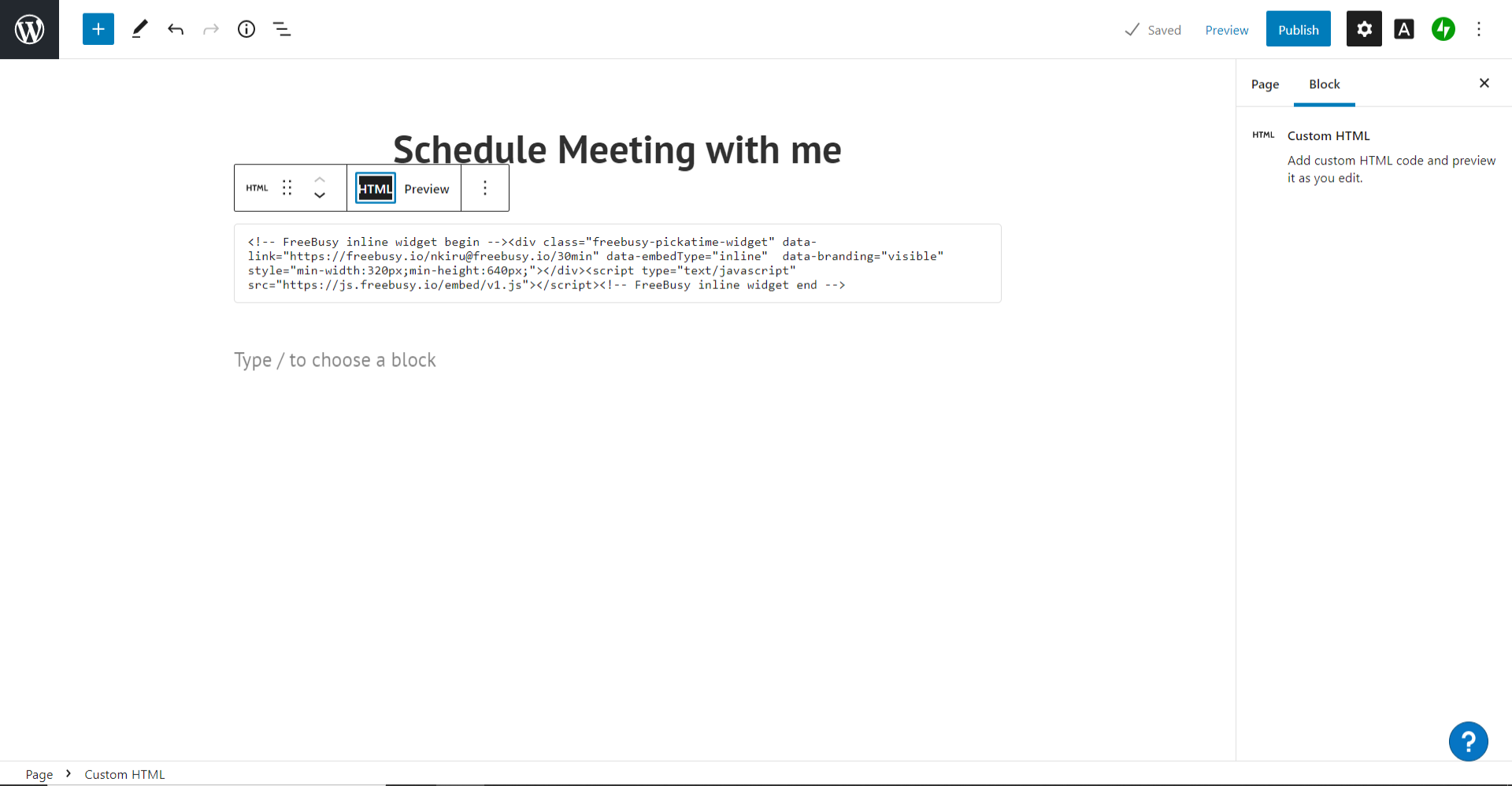 Once you click “add to website” in Freebusy and select your preferred widget as explained above and then copy code, go to your WordPress website: