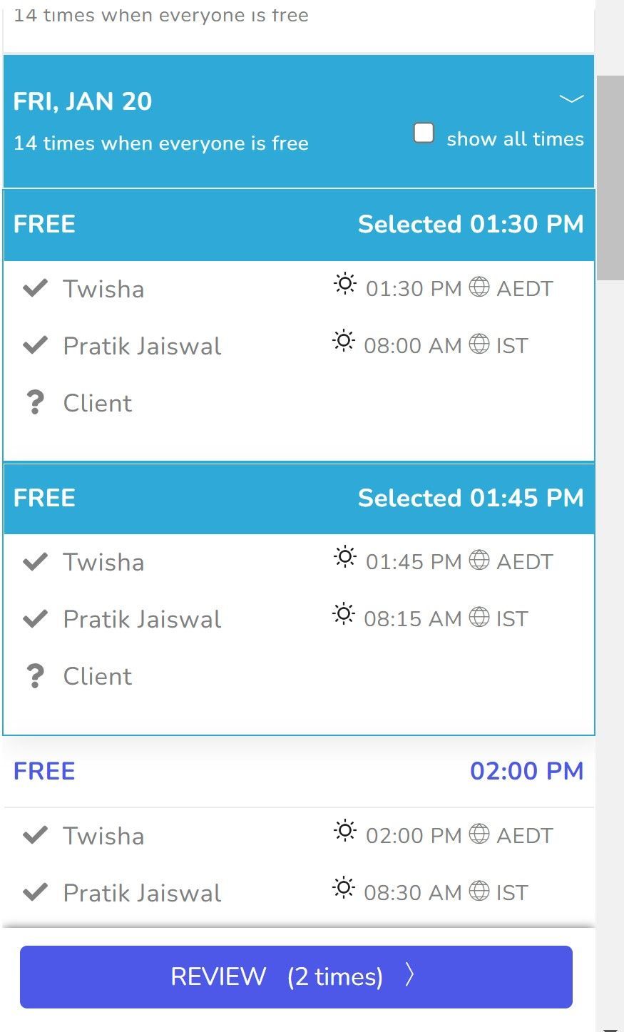 Select the times for you participants to vote on and click on “Review”. You will be able to see time zone of participants if they are also on FreeBusy.