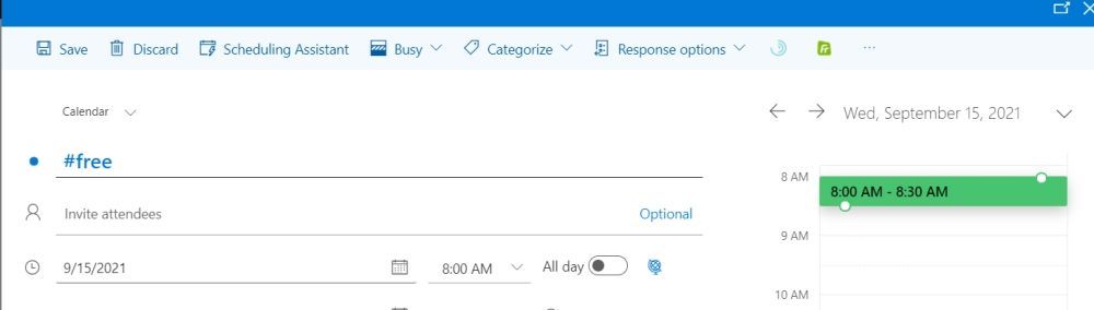 On your Outlook Calendar, click on the date to create a new event for the times you want to make available for meetings. Set the title of the to “#free” (no quotes). You can also include other text like “#free for office hours” or “Hold for office hours #free” as long as “#free” (no quotes) appears somewhere in the event title. #free MUST be present in the title.