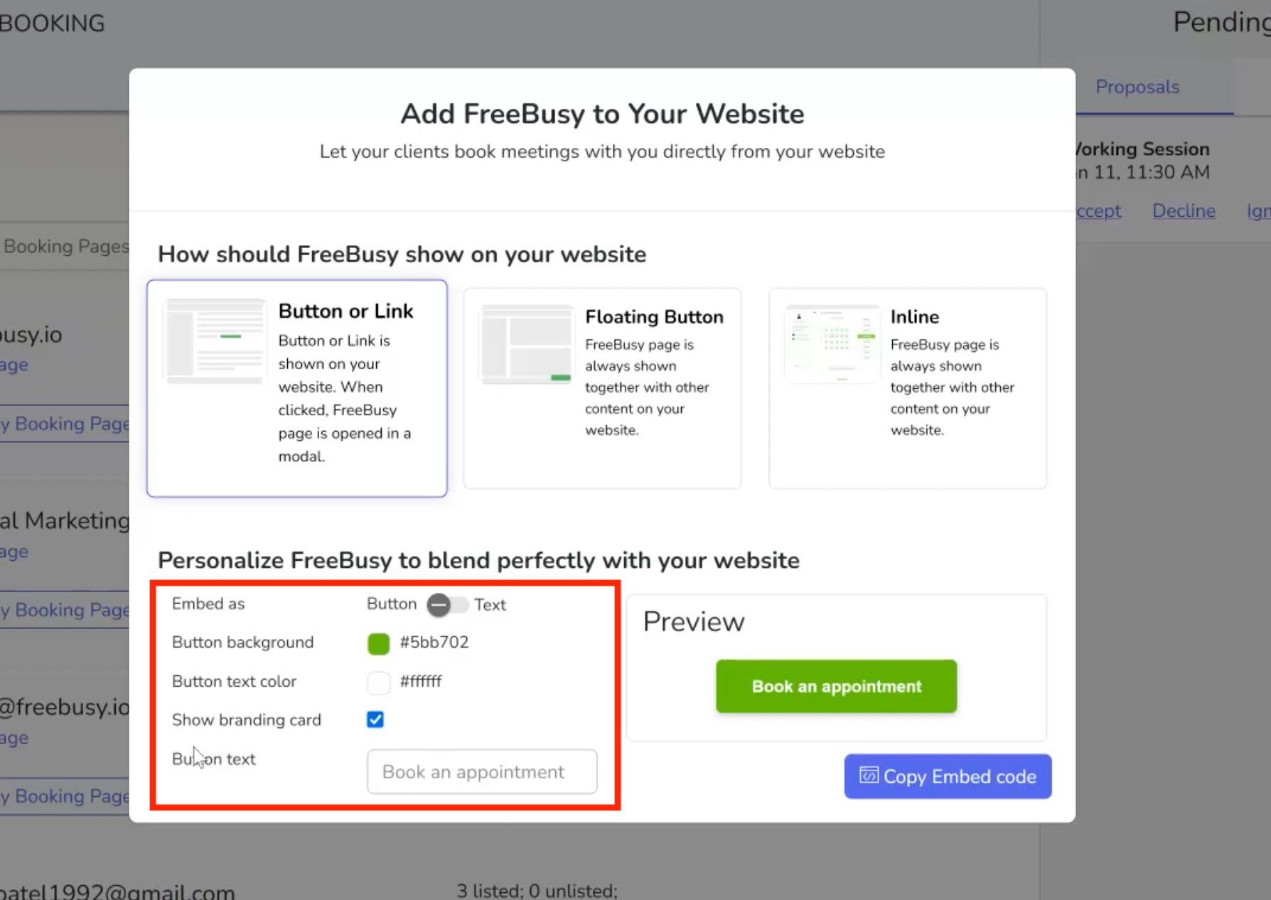 Step 7: Once selected, click "Copy Embed Code" button and share it with your team who manages website to embed Appointment type on your booking page.