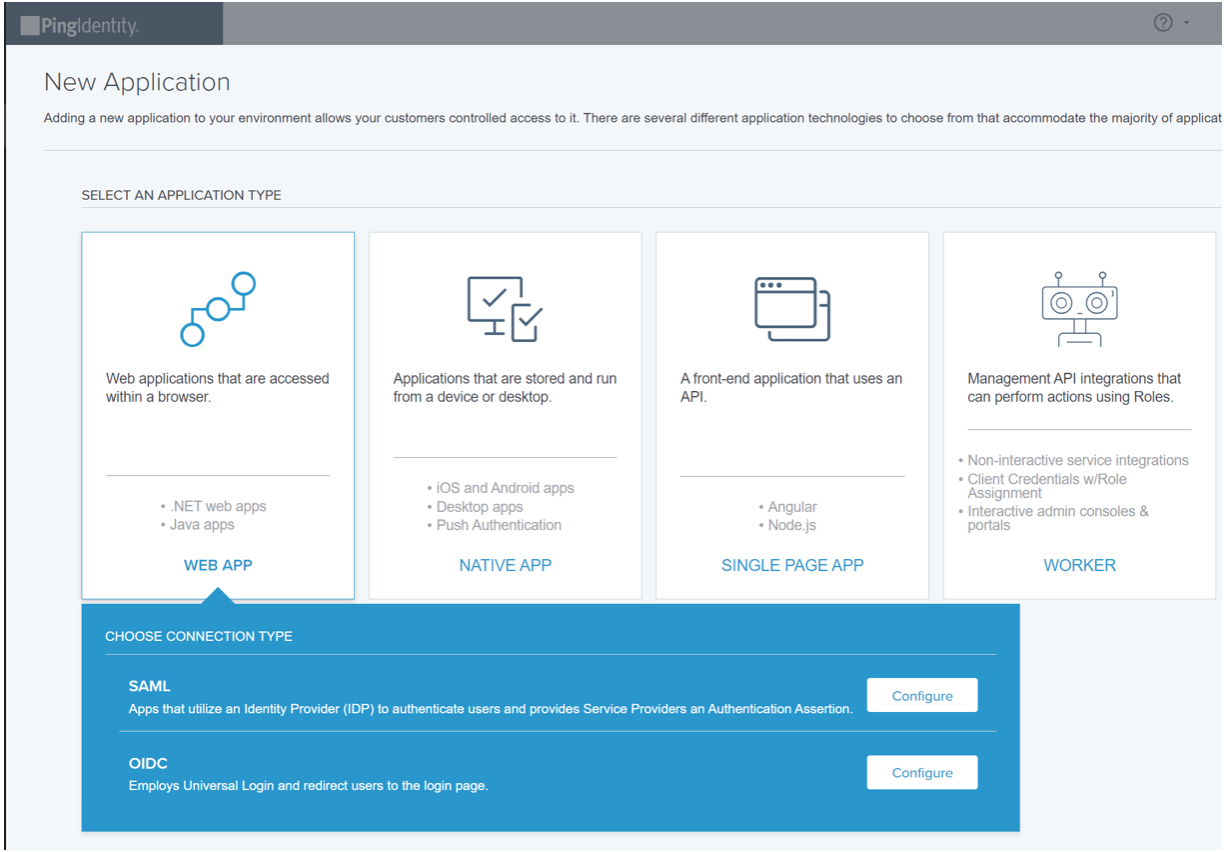Create a new SAML Application in your Ping Identity tenant, by going to Connections → Applications, then click Add Application. Choose Web App and SAML, then click Configure.