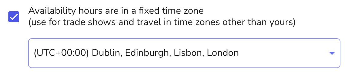 For example, if you are traveling from San Fransisco to Sydney from 5 Jan to 15 Jan, and you are available to schedule meetings between 10:00 AM to 5:00 PM AEDT (Australian Eastern Daylight Tim). You can create a new event template for all dates that you are in Sydney and fix your timezone to AEDT.