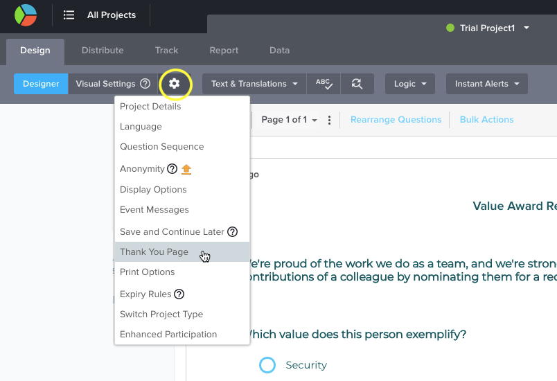 - SoGoSurvey lets you customize the experience for the customer once they submit the form. To configure these settings, click on the gear icon and select the Thank You Page option.