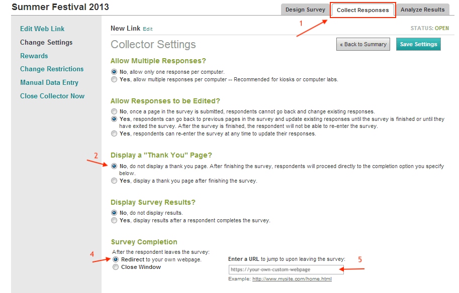 - Set the other Collector settings as per your own requirements of the survey