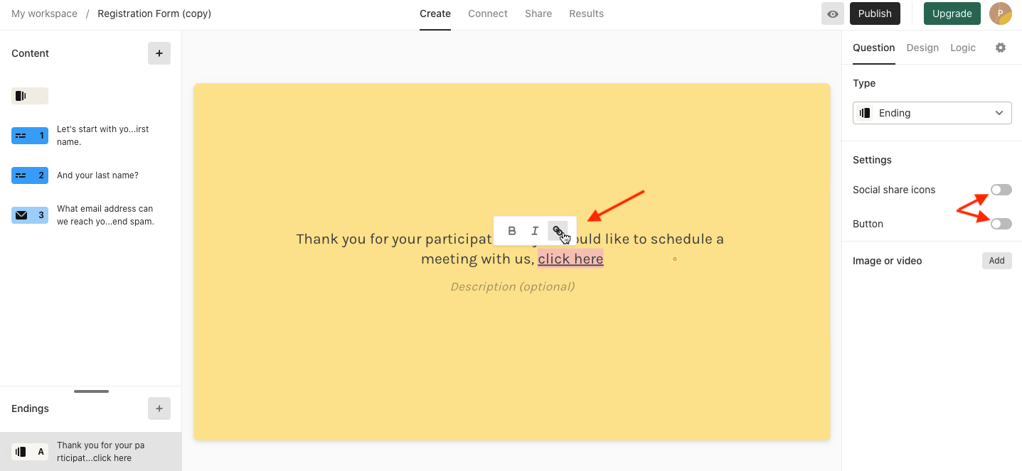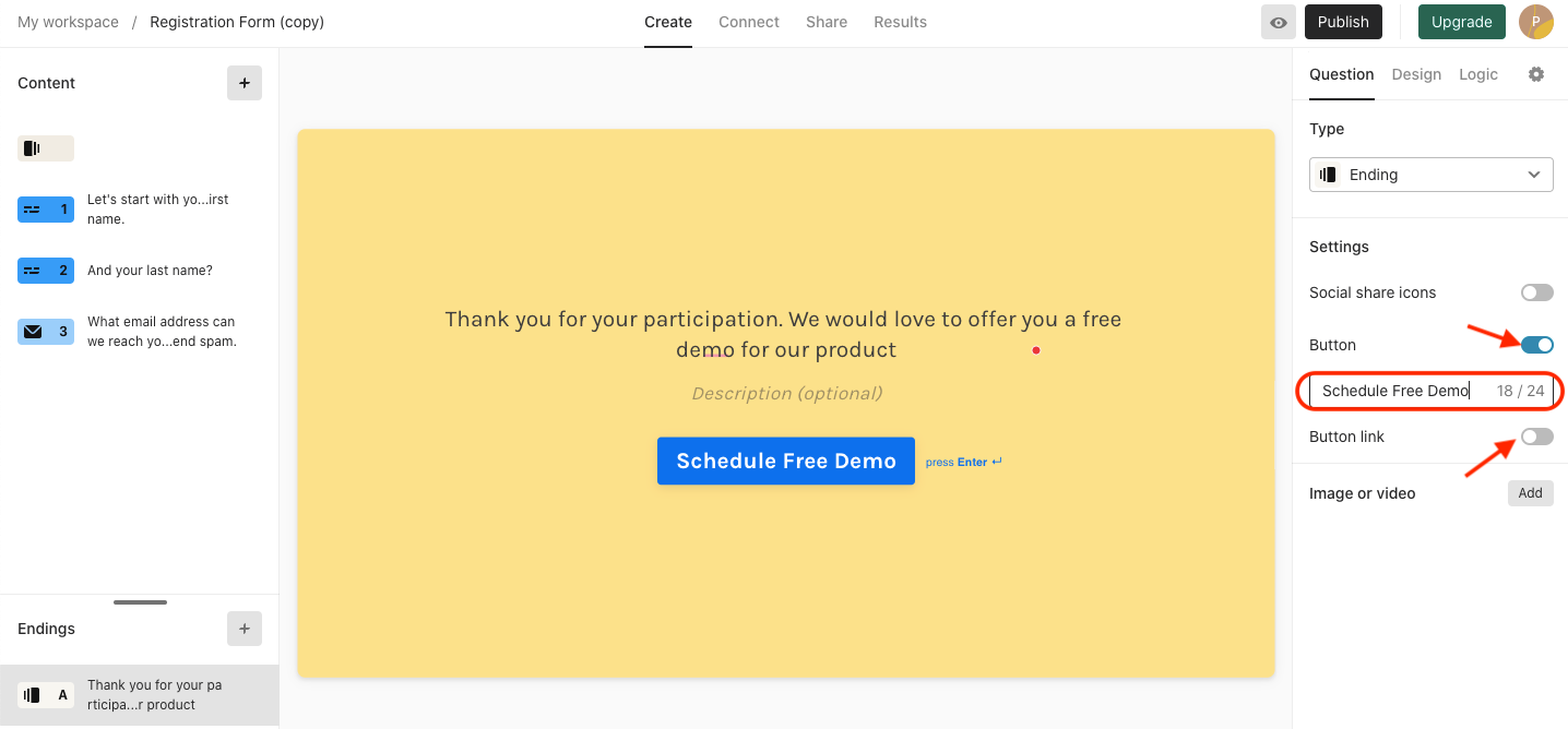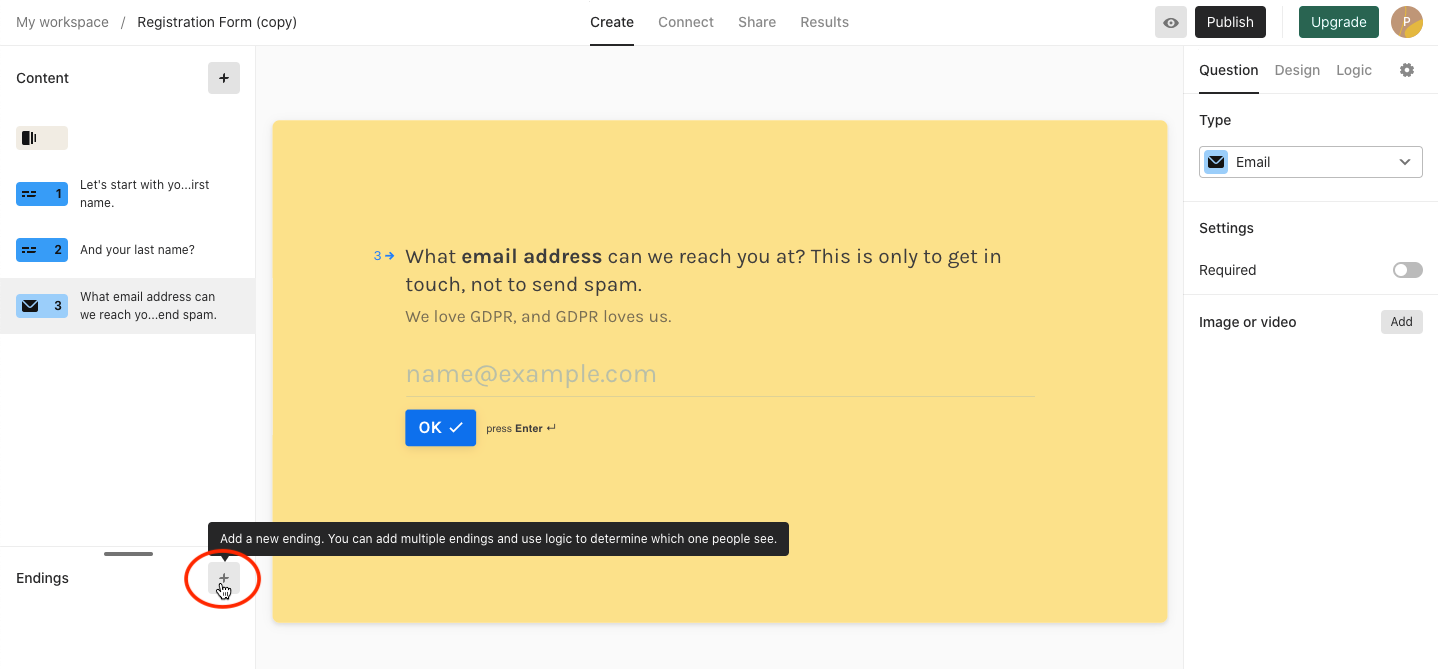 TypeForm lets you customize the experience for the customer once they reach the end of the survey. To configure these settings, click on the ‘+’ icon in the Endings section as shown