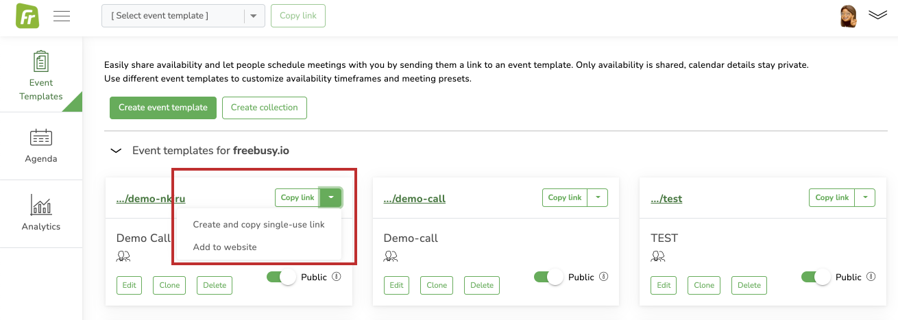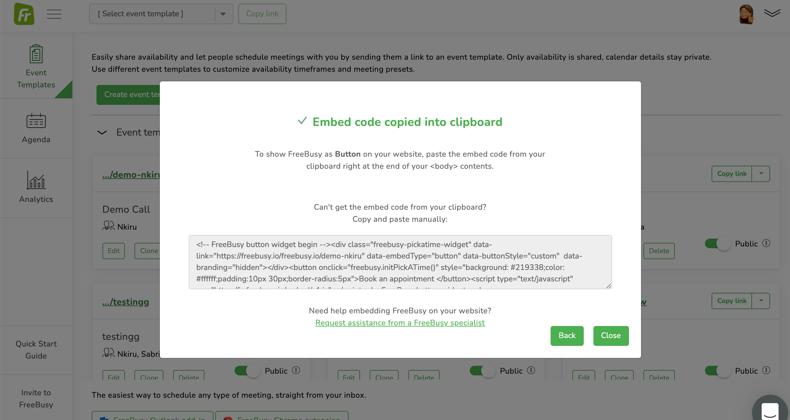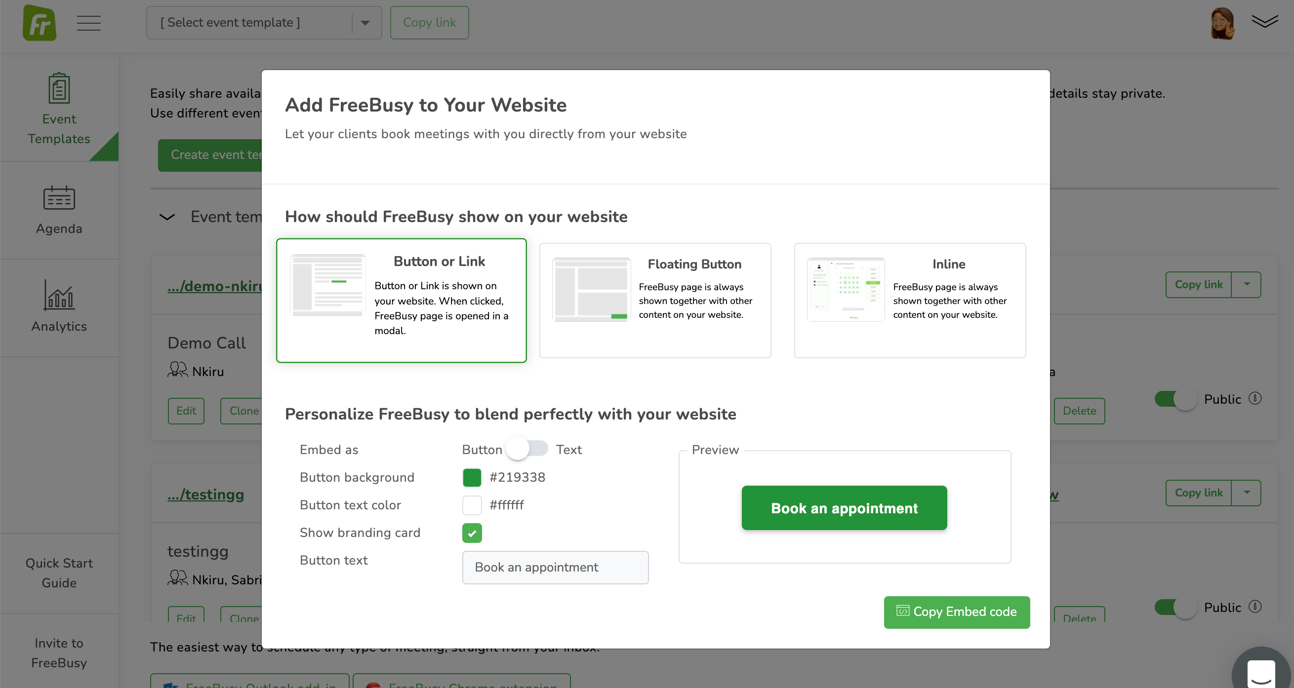 Go to the event template on your FreeBusy page and if you click on the dropdown next to the copy link button on the event template, then it gives you an option to Add to Website.