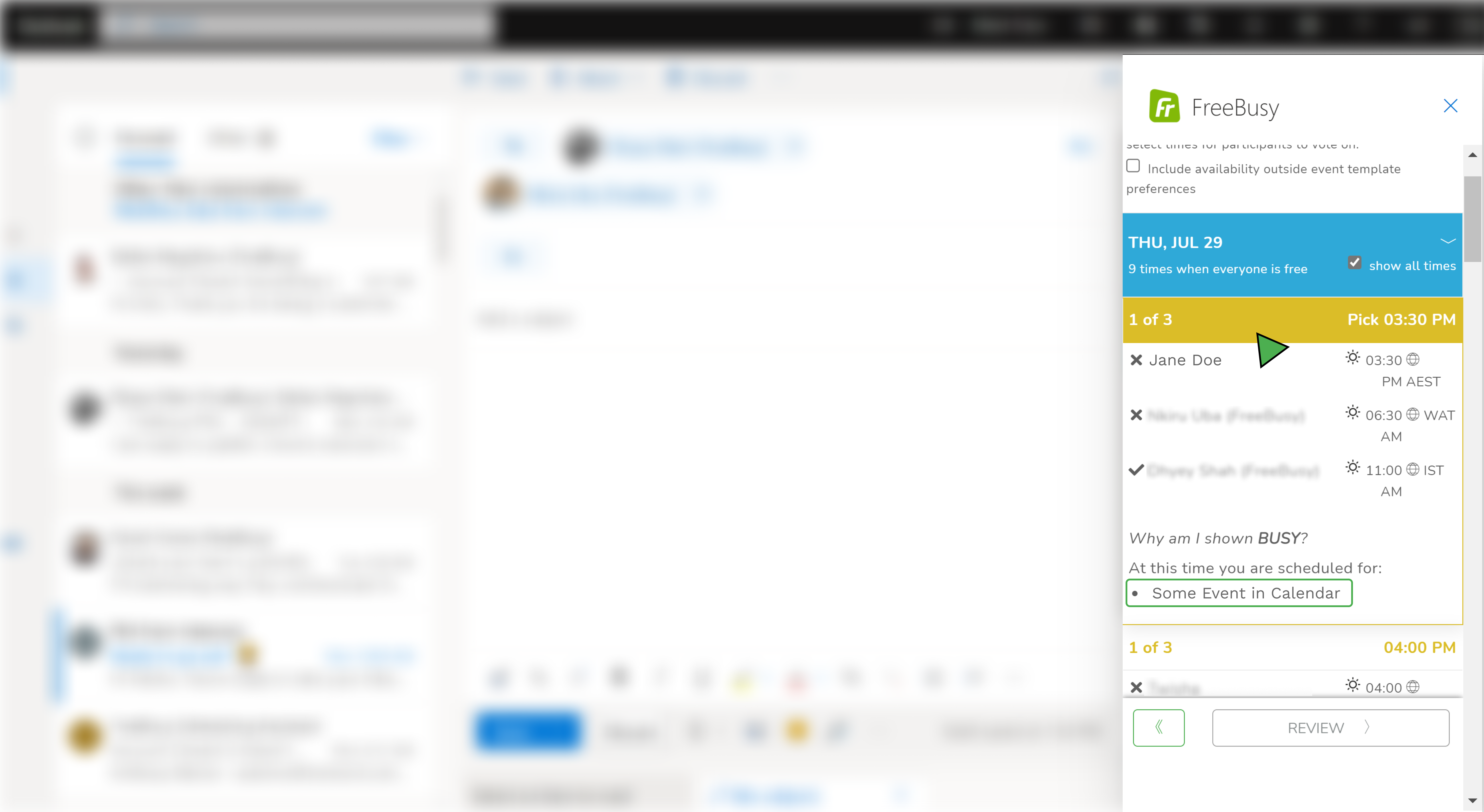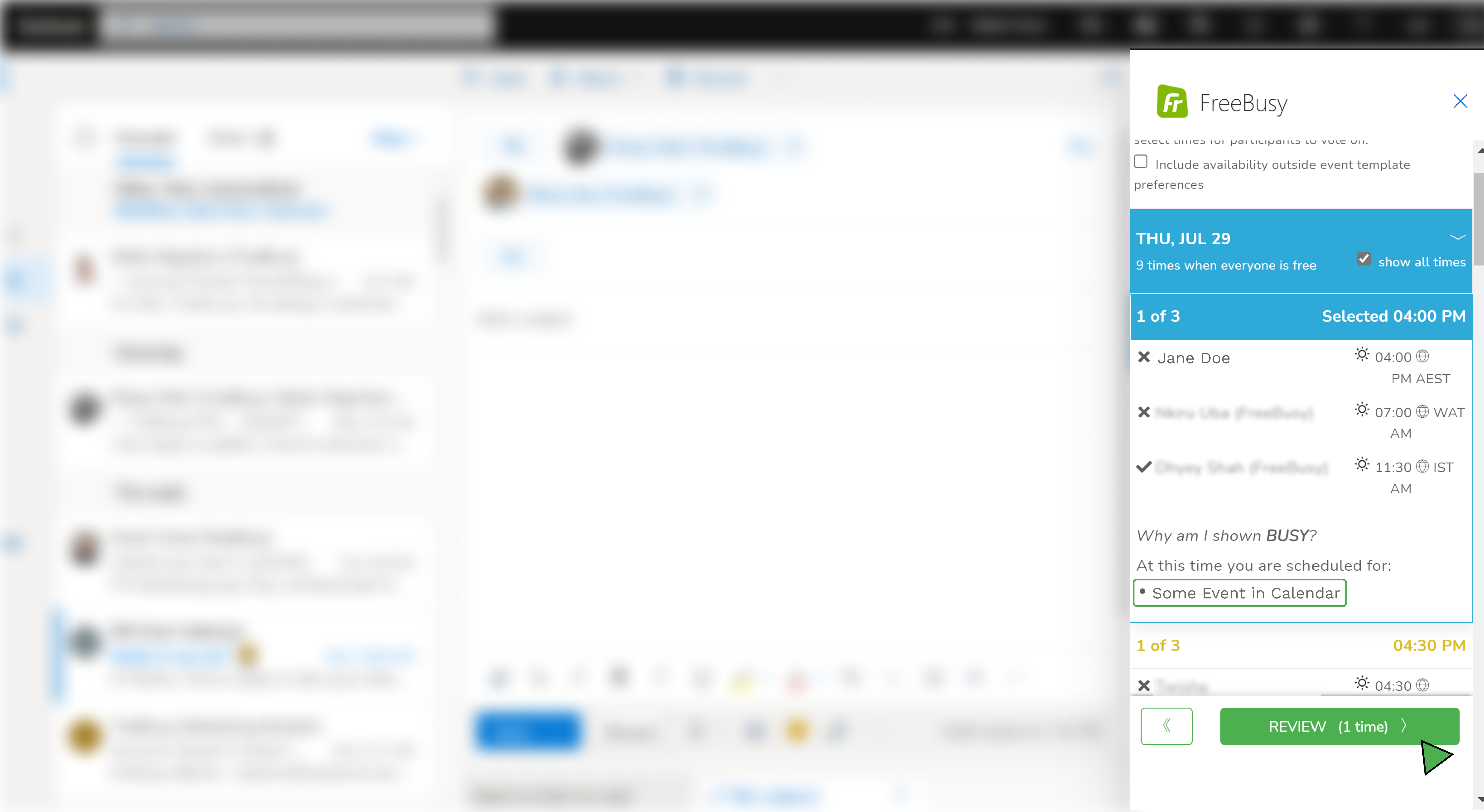 For example, in the screenshot below, Jane is busy at 3:30 PM in "Some Event in Calendar". Since she turned on "show all times" option, she can select and share this time to get booked for meeting.