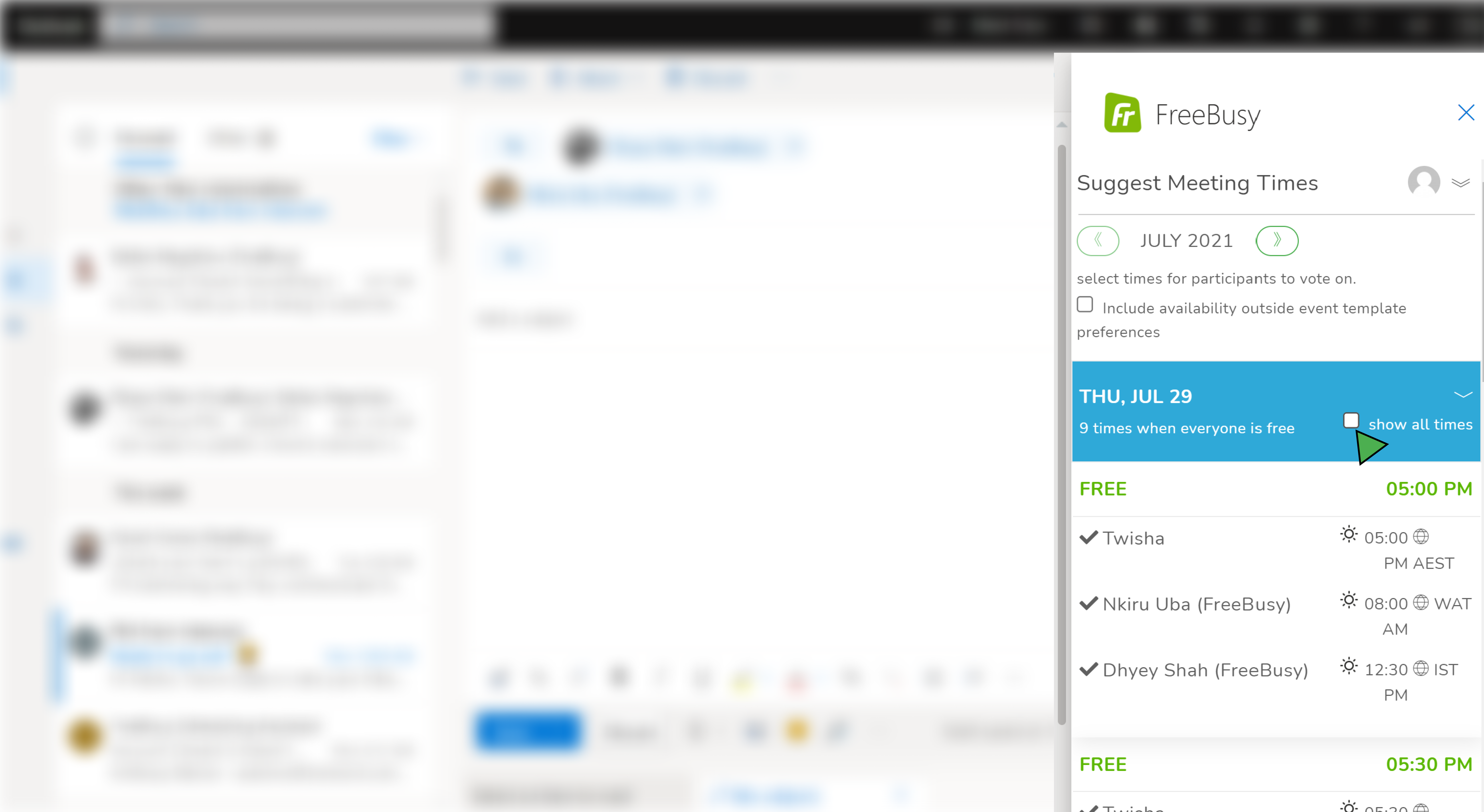 FreeBusy now shows you all times including when you are busy or out of working hours.