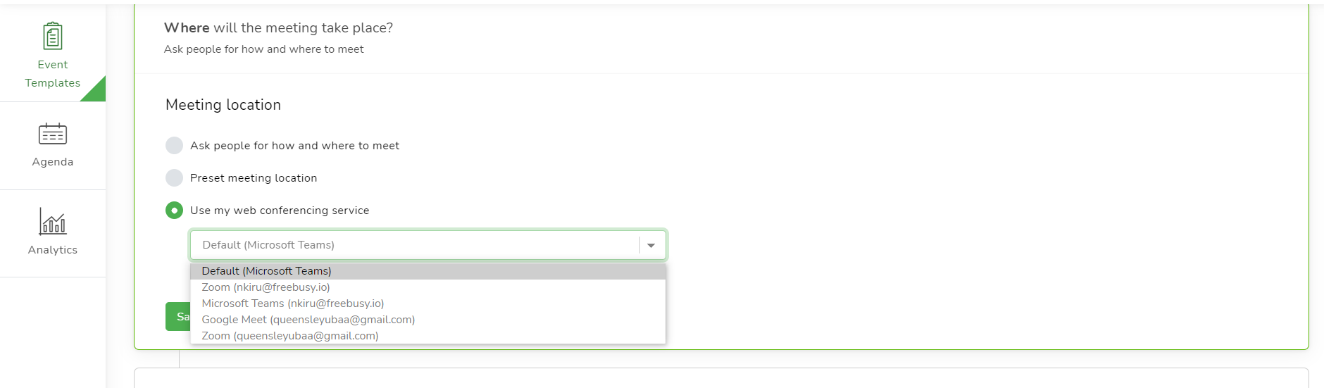 - Next, go FreeBusy in the calendar and integration section, choose the conferencing service (zoom, teams, google meet, etc.), you prefer, and try to link web-conferencing service,