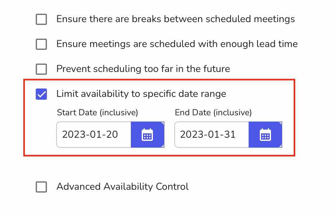 Use this feature if you have regular availability between certain dates. For example, if you are hosting an event and getting bookings for it between Jan 10, 2023, to Jan 30, 2023, from 8:00 AM to 4:00 PM, you can setup event template this way.