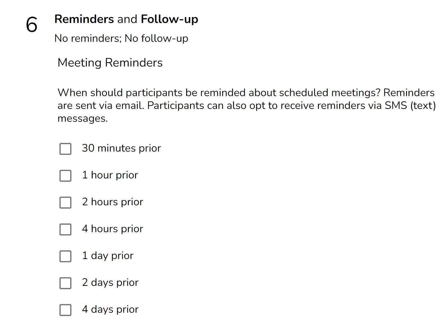 After this when meetings are scheduled using this Appointment type participants, will receive the reminders on their email. They will also have an option to receive SMS reminders when they book the appointment.
