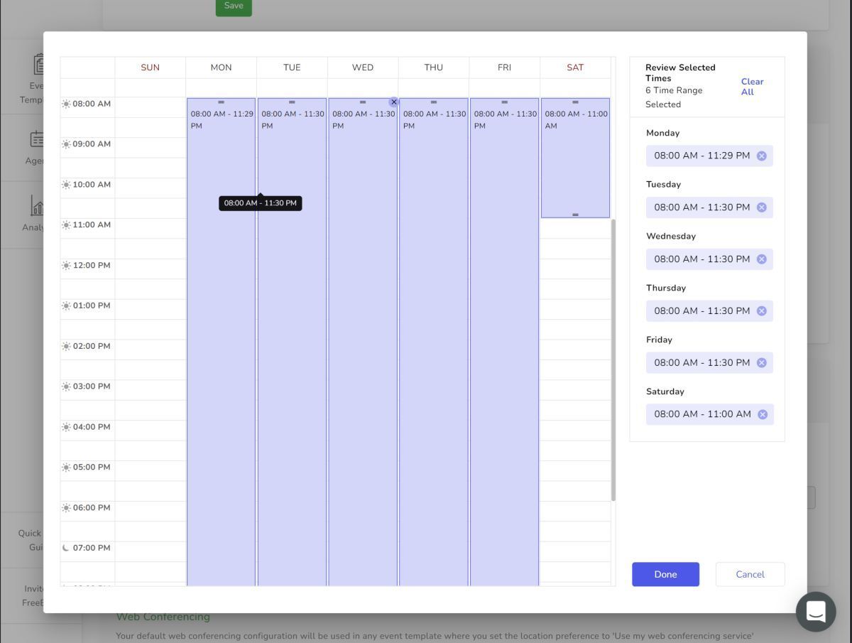 Step 3: Update your work hours based on your available time for meeting and click "Done".
