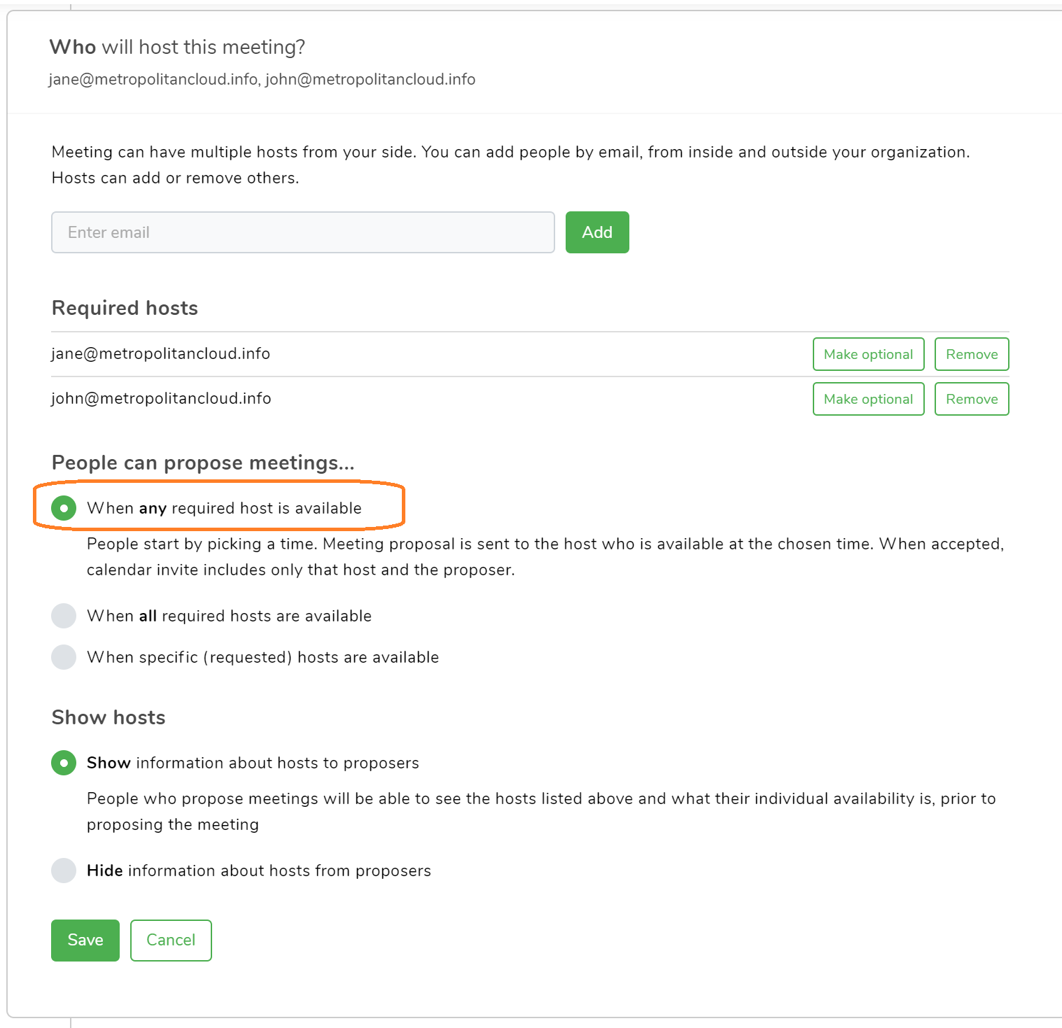 External participants would be able to pick manually organizer if more than one would be available for selected time