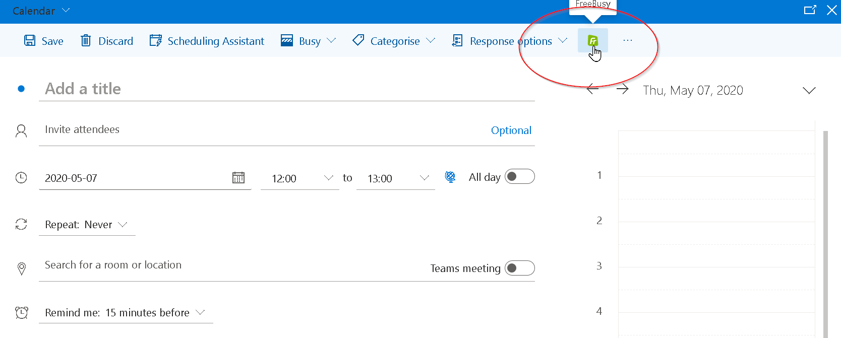 When you schedule or reschedule a meeting in Outlook web, you`ll be able to open the FreeBusy add-in from the upper toolbar in the event editing extended dialog: