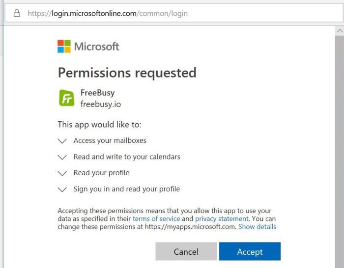 The objective of this task is to grant FreeBusy the OAuth permissions to necessary access calendars for people in your Office 365 tenant. Consent could be given by individual users (if domain policy is set to allow them to give consent) or by an admin on behalf of the users. This task covers the latter option.