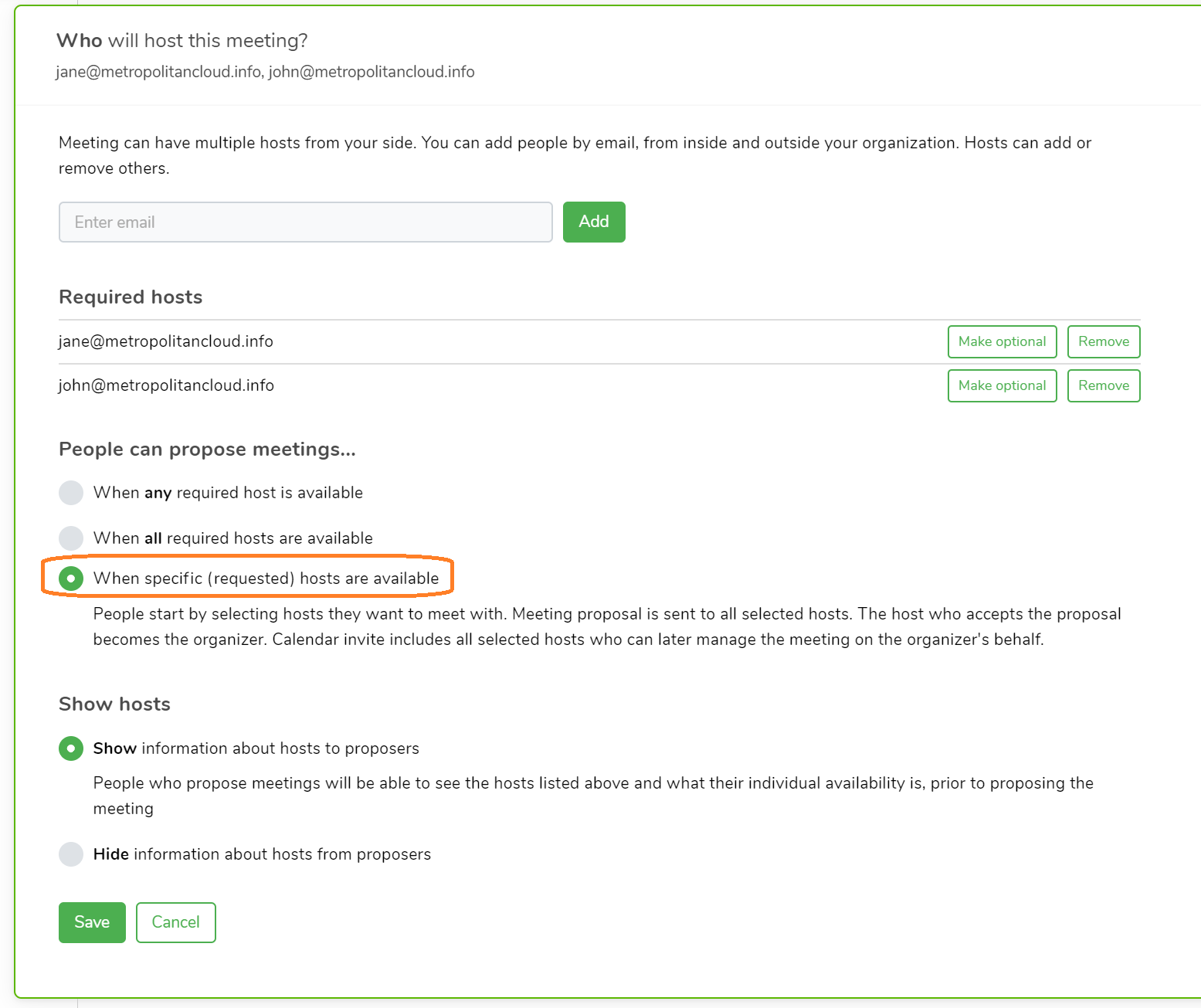 3. When specific (requested) hosts are available. External person starts by selecting hosts they want to meet with. Meeting proposal is sent to all selected hosts. The host who accepts the proposal becomes the organizer.